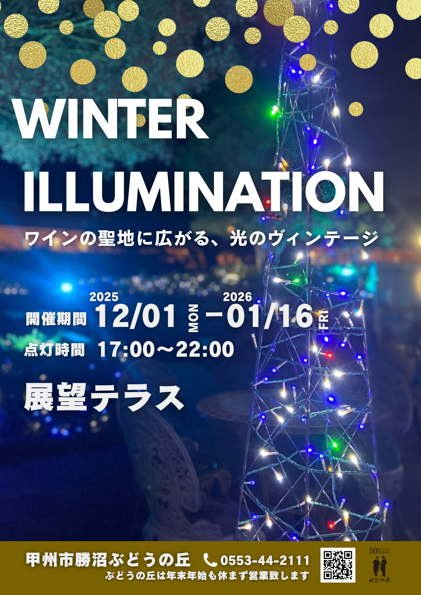 今年も「勝沼ぶどうの丘」に、幻想的な光の世界が広がるイルミネーションが登場します。
