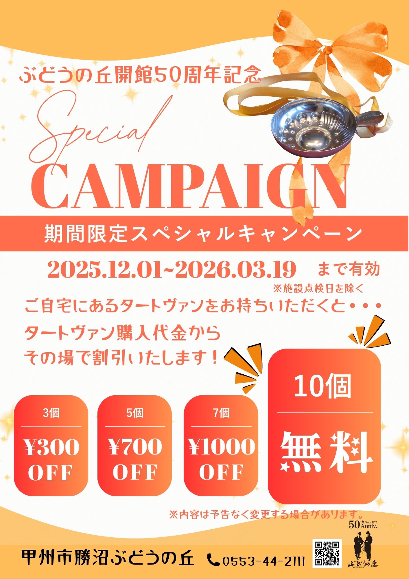 令和7年12月1日より、開館50周年記念といたしまして、タートヴァン割引キャンペーンを実施致します!!